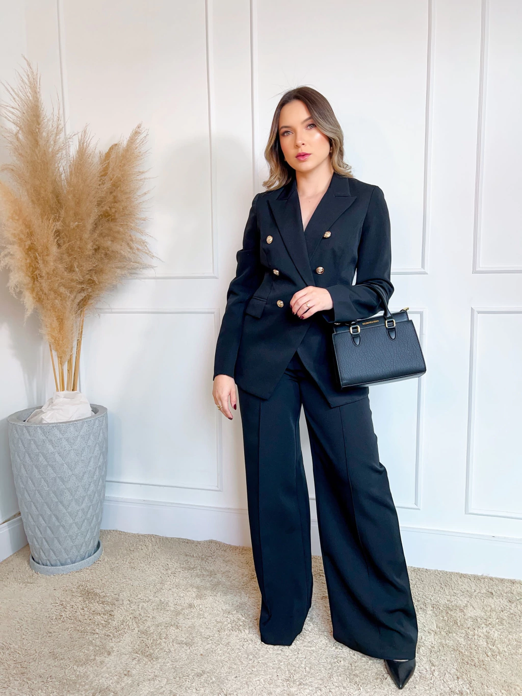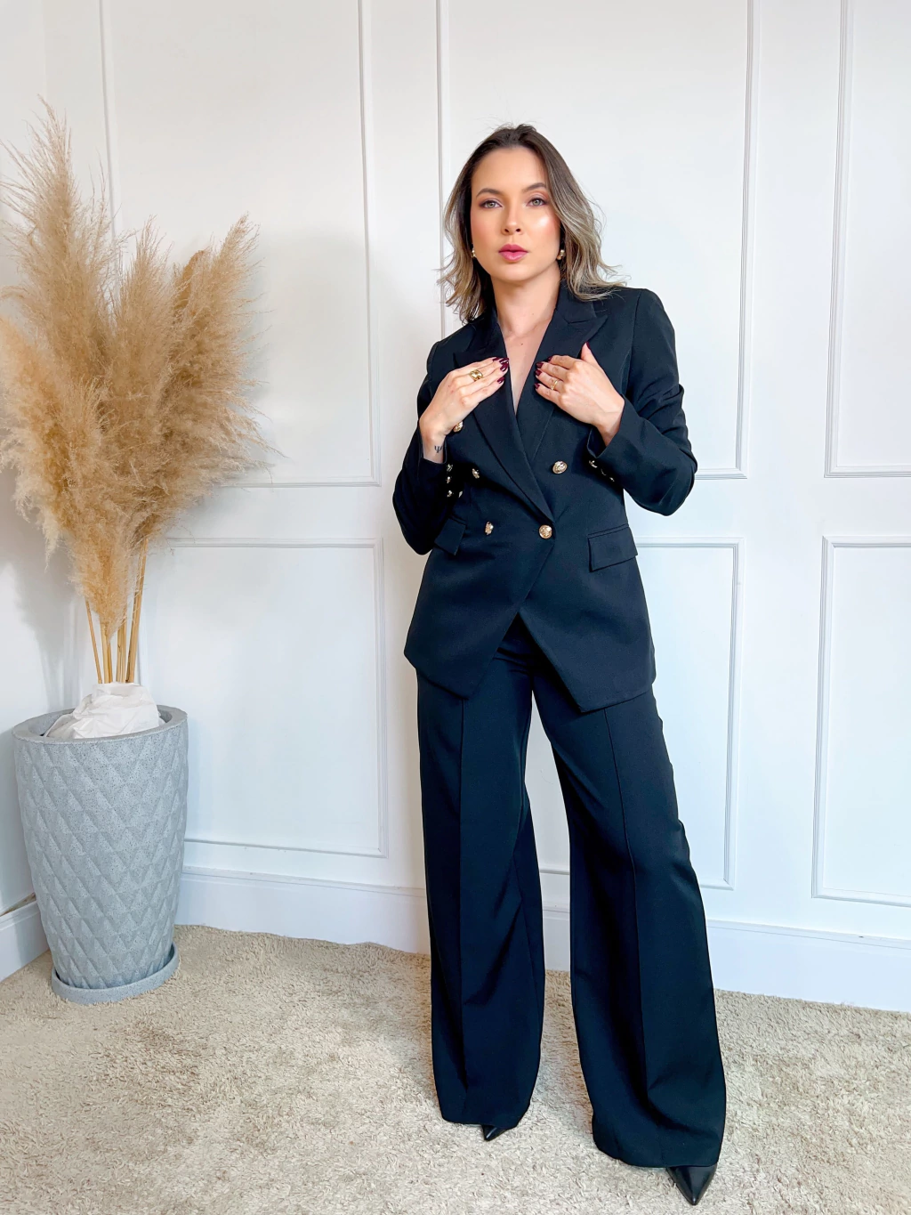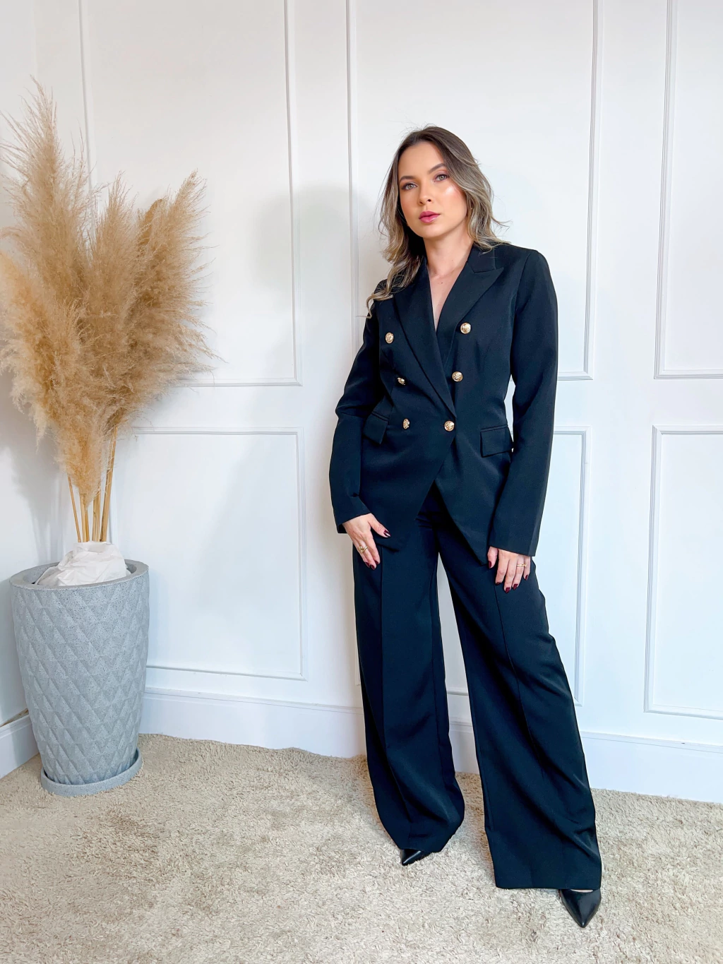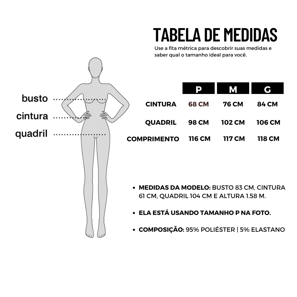 Calça pantalona com nervura frontal, bolso verdadeiro e fechamento com botão dourado. Modelagem elegante que alonga a silhueta e garante conforto com sofisticação.